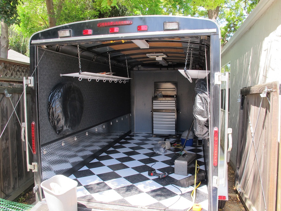 I had aluminum tread plate down the center of my race trailer with the checkerboard tiles around the edges for accent and color. I dont really wanna use the wood flooring alone due to looks. Anyone put down a simple tile floor (stick down type) in an enclosed trailer? Rv vinyl flooring covers wood, steel, or concrete floors inside your race car trailer or toy hauler · vintage black and white checkerboard pattern gives your . That will give your enclosed trailer a unique look that's all your own.